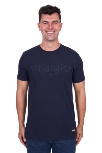 Classic tee shape, rib neck band, Wrangler iconic logo hem label