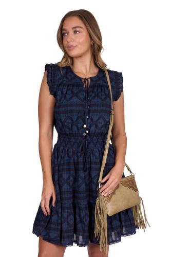 Short ruffle sleeve dress with tie front and bead detail, centre front button up opening, front and back yoke with gathering, fully lined, side seam pockets, gathered ruffle at hem edge, Wrangler logo pip on side seam