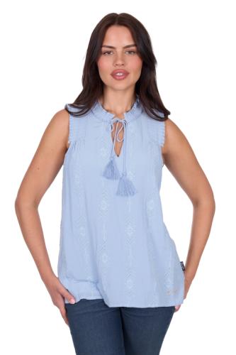 Pleat panel sleeveless blouse, v-neck opening, front tie and tassel detail, front lining only, Wrangler logo pip on side seam, soft handfeel and drape